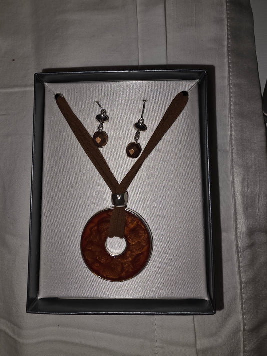 Boho Amber Colored Resin Ring Pendant Necklace & Earring Set