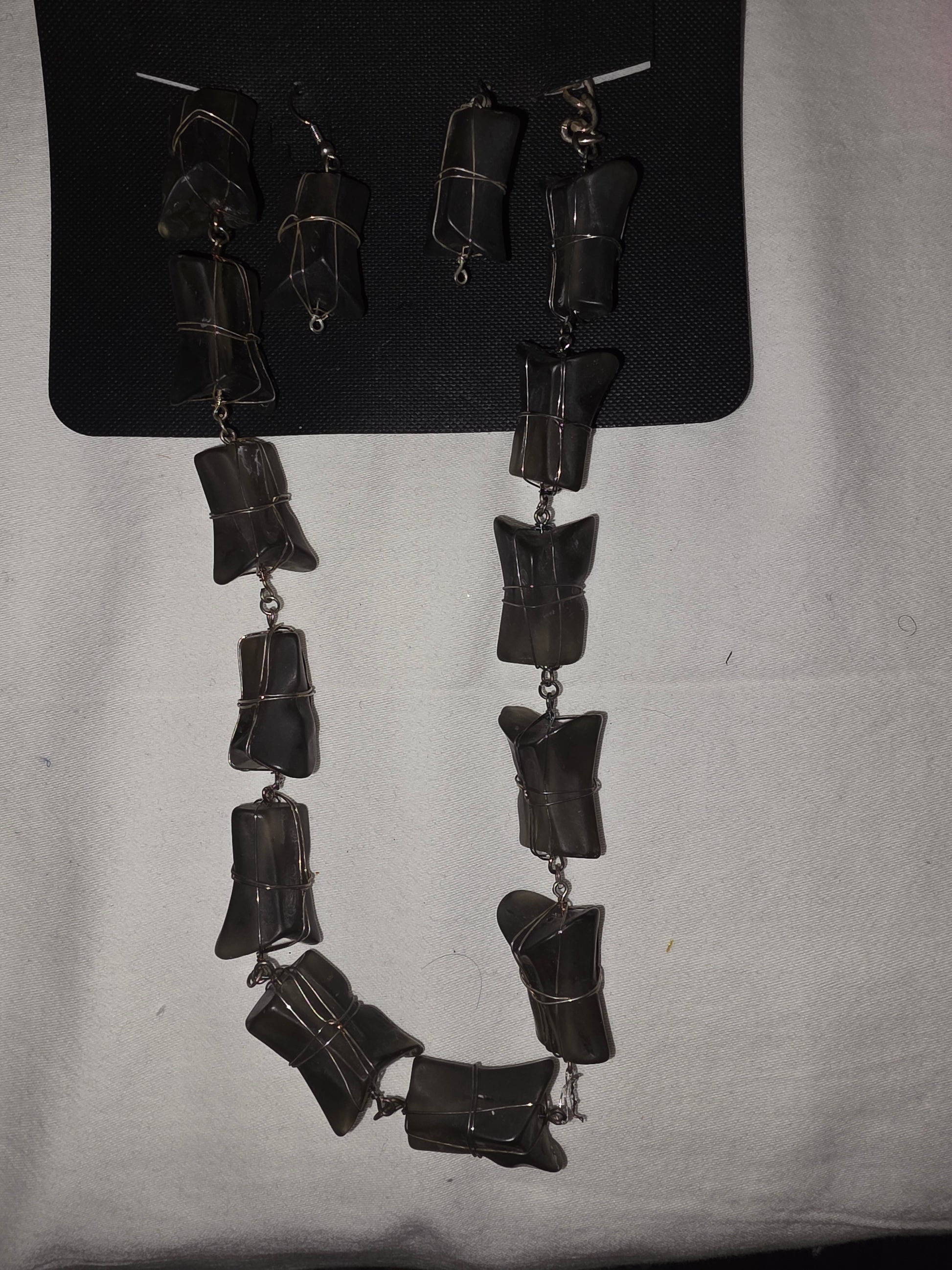 Make a bold, artistic statement with this unique necklace and earring set. Each piece in the set features abstract, wrapped-link components, reminiscent of brutalist or modernist design. The metal elements have a dark gunmetal-tone (or oxidized silver/hematite-tone) finish and are intricately wire-wrapped to create a distinct, artisan-crafted look.