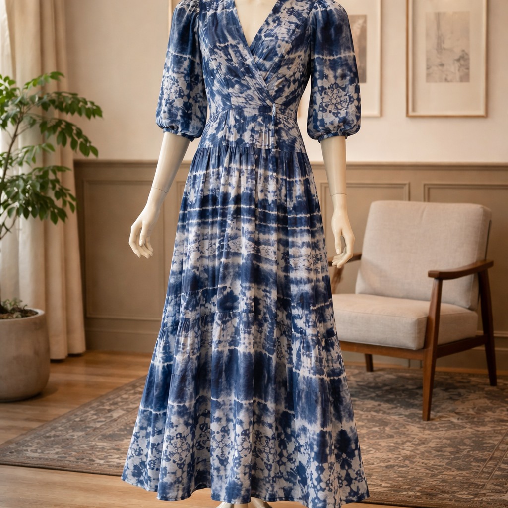 This Calvin Klein dress is defined by its stunning indigo and white tie-dye pattern, offering a unique, "one-of-a-kind" feel to every piece. Featuring a flattering faux-wrap bodice and a tiered maxi-length skirt, the design is anchored by sheer, 3/4-length balloon sleeves that add a touch of romantic volume and airiness.