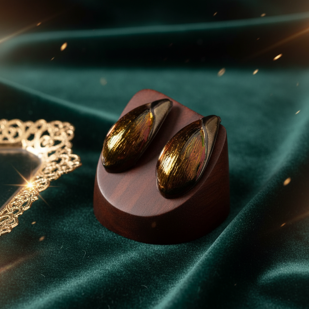 These exquisite studs feature ethically sourced, real jewel beetle wings (Buprestidae family), celebrated for their stunning, natural metallic green and gold iridescence. Each wing is a miniature masterpiece of nature, offering a shimmering, oil-slick effect that shifts in the light. Set on simple, dark backings, these earrings are a bold statement piece of natural art, perfect for the eco-conscious jewelry lover seeking a one-of-a-kind accessory.