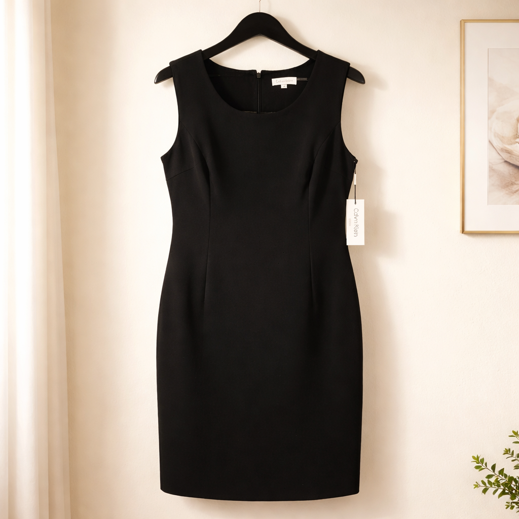 This Calvin Klein dress is defined by its clean, architectural lines and sophisticated "Noir" black hue. The sleeveless, round-neck silhouette offers a polished and authoritative profile, making it an essential piece for everything from high-stakes boardroom meetings to refined evening cocktails.